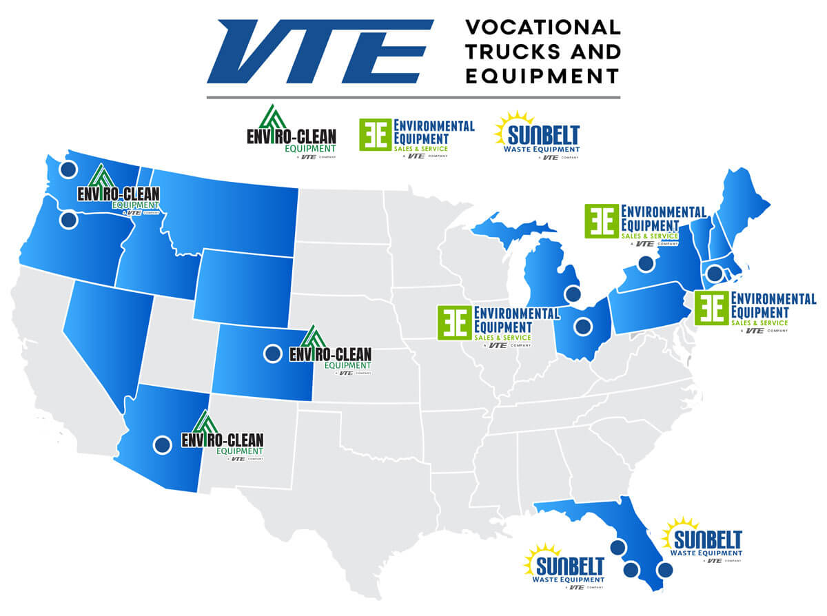 Enviro-Clean is proud to be part of the Vocational Trucks and Equipment (VTE) dealer group. As the nation’s leading provider of essential environmental services equipment, VTE companies best brands, expert teams, and locations across the nation deliver trusted solutions and unmatched support for fleets from coast to coast.